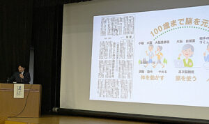 続いて石内勝吾教授より脳の第4の可塑性である成人海馬の神経新生能に関して、ヒト脳では年齢を問わずyoung neuronsが生成されていること、機能的なMRIや独自に開発した海馬機能検査で新生能を評価できること、young neuronsは既存の回路に組み込まれることが重要で、そのためには頭を使うこと常に問題意識をもって興味のある課題に取り込む必要があること、散歩や庭いじりなどの身体活動が新生の促進に寄与すること、野菜・果物・オリーブオイルを豊富に含む地中海食を中心に地元の食材を中心とする食事は健康長寿に利することなどを話された。会場は満席で、海馬機能検査や腰HALのデモには行列ができていました。
